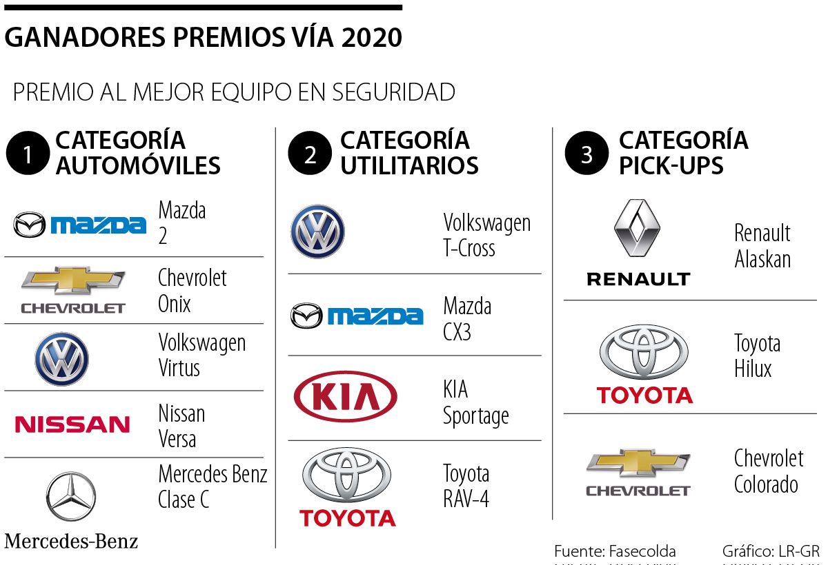 En la edición 2020, los automóviles ganadores en la categoría de mejor equipamiento en seguridad fueron el Nissan Versa y el Volkswagen Virtus, en la sección de carros entre $55 millones y $70 millones; el Mercedes Benz Clase C, en los de más de $70 millones; y el Mazda 2 junto al Ónix, para los de hasta $55 millones.