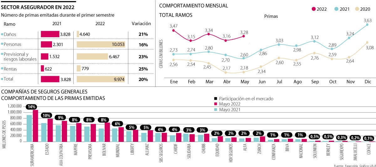 El tema de seguridad social fue el de mayor crecimiento en el primer trimestre frente a 2021. En este ramo están las rentas con 25% de variación y los seguros de Riegos laborales, y el previsional de invalidez y supervivencia, con 23%. En las primas emitidas para los seguros de daños, entre los que se encuentran los ramos de automóviles, soat, incendio, lucro cesante y terremoto, y cumplimiento, se dio una variación de 21%. Y en las primas de seguros de personas que se refieren a salud, vida y accidentes personales, el crecimiento fue 16%.