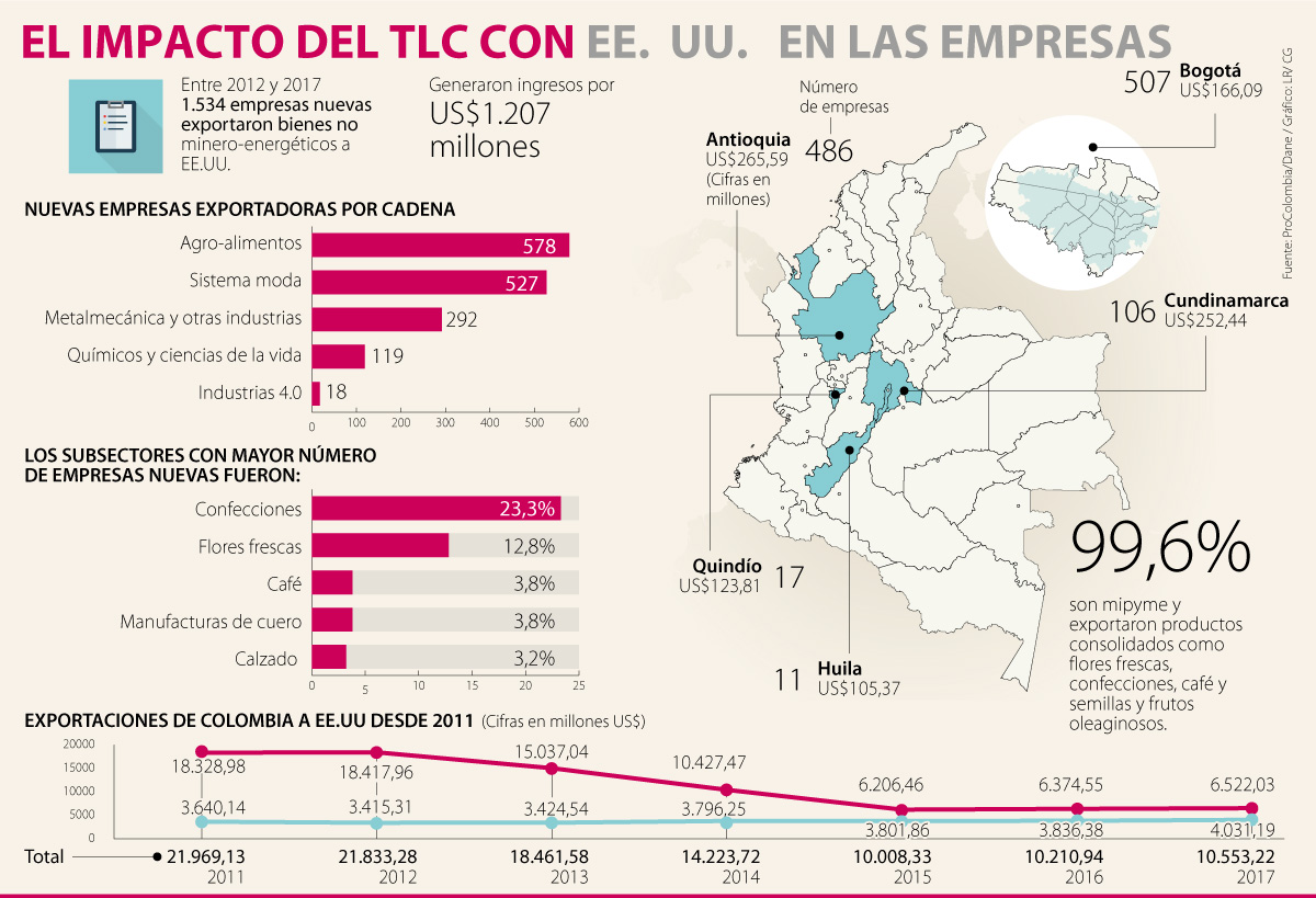 Para el presidente de ProColombia, Felipe Jaramillo, la entrada en vigencia del TLC con EE. UU. “tuvo un impacto positivo sobre las exportaciones colombianas hacia ese país. En efecto, antes del acuerdo, el valor de las exportaciones no mineras hacia Estados Unidos fluctuaba alrededor de US$ 273 millones mensuales, en tanto que dicho valor actualmente fluctúa alrededor de US$ 311 millones y continua en aumento”.