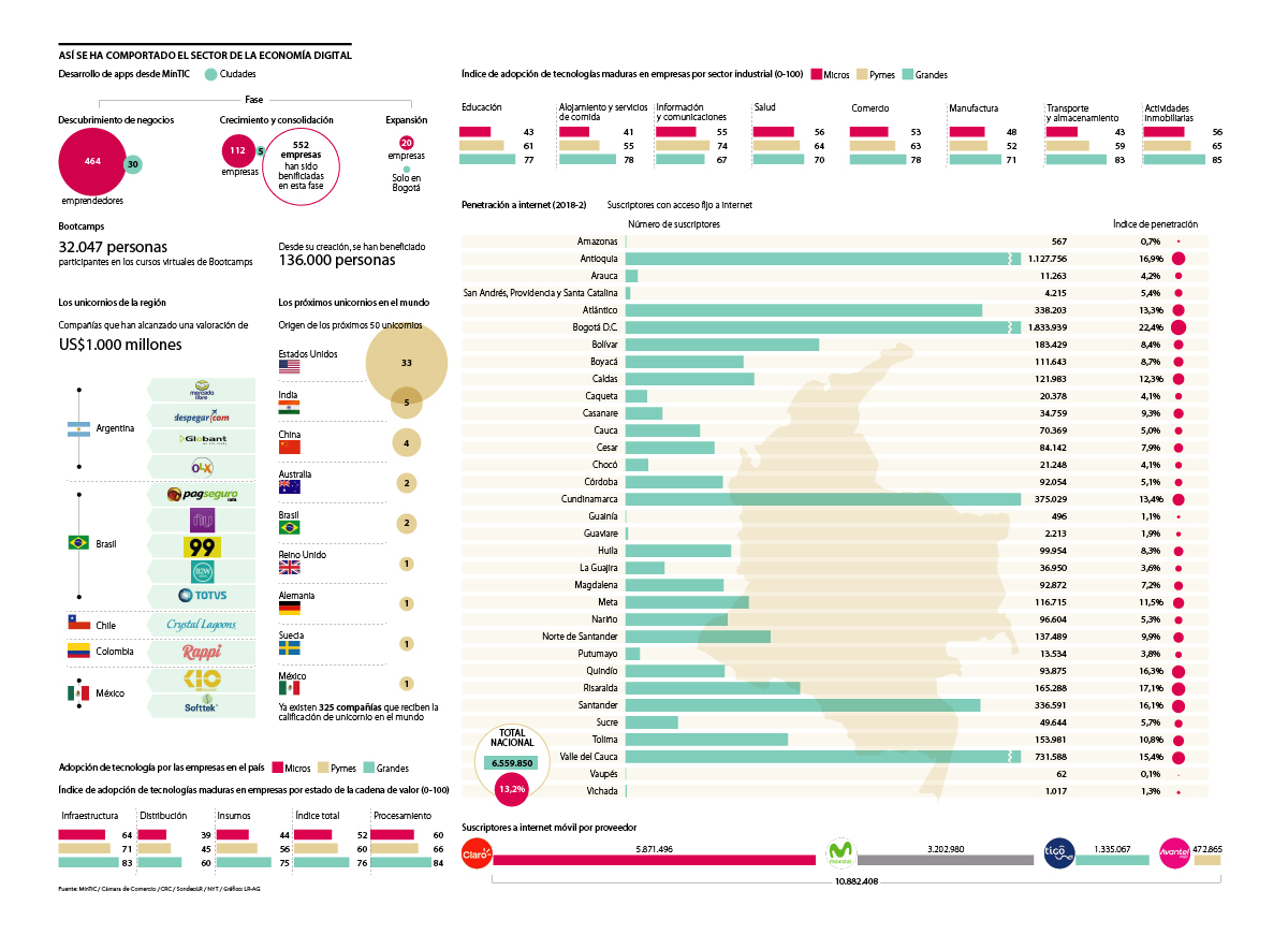 Con respecto a la creación de nuevas iniciativas, de acuerdo con cifras de MinTIC, durante el año pasado el programa Apps.co, llevado a cabo por la cartera de tecnologías de la información y las comunicaciones, alcanzó a convocar a 464 equipos en su primera fase, la de descubrimiento de negocios; de la segunda fase del desarrollo de emprendimientos, conocida como la de crecimiento y consolidación, hicieron parte 112 empresas de cinco ciudades diferentes; en fase de expansión se hizo acompañamiento a un total de 20 empresas, todas radicadas en Bogotá.