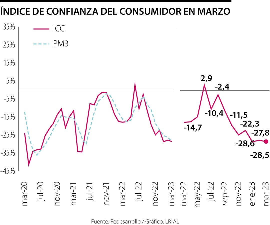 En marzo, la confianza de los consumidores empeoró y pasó de -27,8% en febrero a -28,5%, en la última encuesta de Fedesarrollo. Este es el segundo balance más bajo desde mayo de 2021. El director de Fedesarrollo, Luis Mejía, explicó que “la caída se debe a una disminución de cuatro puntos porcentuales (pps) en el Índice de Condiciones Económicas, contrarrestado por un incremento de 1,6 pps en el Índice de Expectativas del Consumidor”.