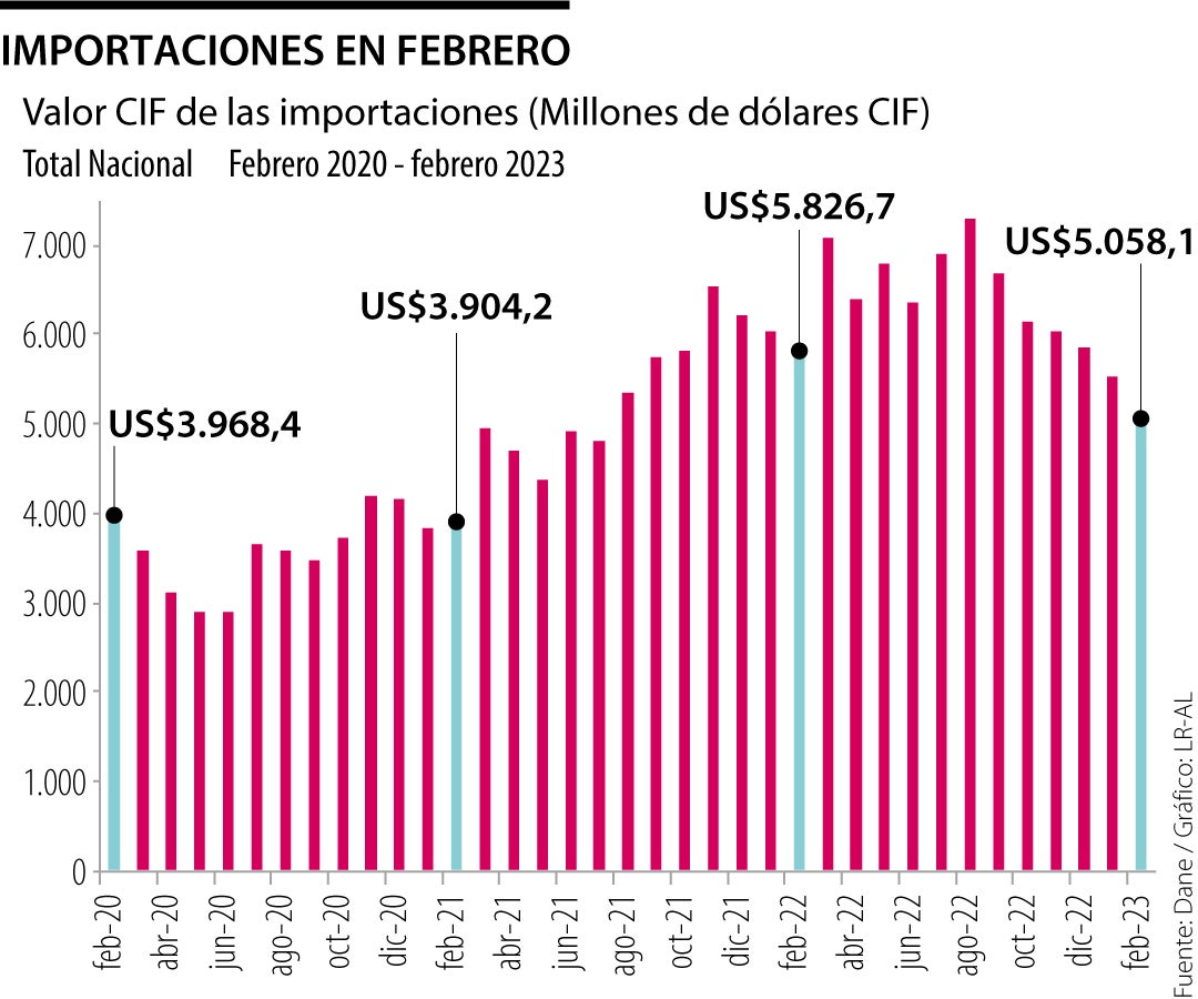 De acuerdo con el reporte del Dane para febrero, las importaciones disminuyeron en 13,2% frente al mismo mes del año pasado, con una cifra de US$5.058 millones. El fenómeno obedece a una baja que se está presentando desde finales del año pasado. El rubro que presentó mayor disminución fue el de manufactura con 16,6% y US$ 3.768,2 millones; y en el segundo lugar están los combustibles y productos de las industrias extractivas, con caída de 4,5% a un total de US$559 millones.
