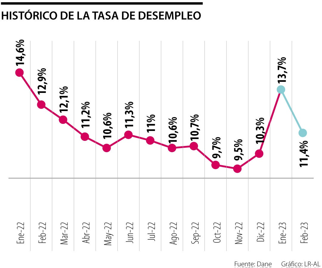 Si bien el mercado laboral mostró signos de recuperación en febrero y la tasa de desempleo bajó 1,5 puntos porcentuales anuales, a 11,4%, Sergio Olarte, economista principal de Scotiabank Colpatria, dijo que se debe analizar la gran cantidad de personas que no reportan que están trabajando y que salieron de la industria del empleo, “lo que hizo que, como la cantidad de gente que busca empleo es menor, la tasa ‘como un todo’ cae”.