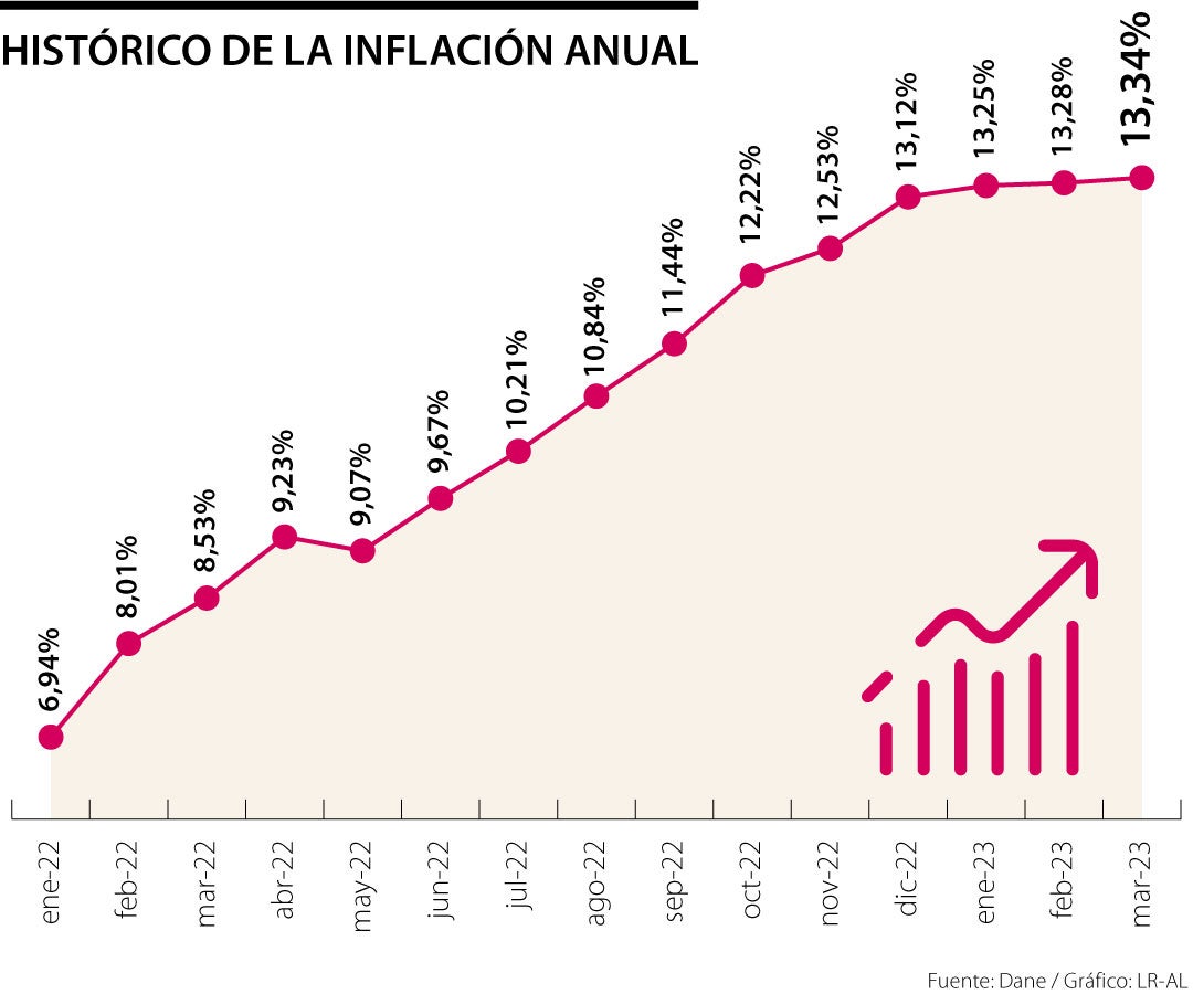 Todo sigue estando muy caro. Solo en marzo, en comparación con hace un año, los precios de la canasta básica familiar subieron 13,34%, más de lo que esperaba el mercado (13,27%) y marcando un nuevo máximo. De hecho, el de 2023 fue el marzo más caro desde 2007. Seguramente ha visto que hacer mercado es mucho más costoso, y es que los alimentos y las bebidas siguen siendo los que más impulsan la inflación, pues crecieron 21,81% en el último año y aportaron 4,05 puntos porcentuales al dato total.