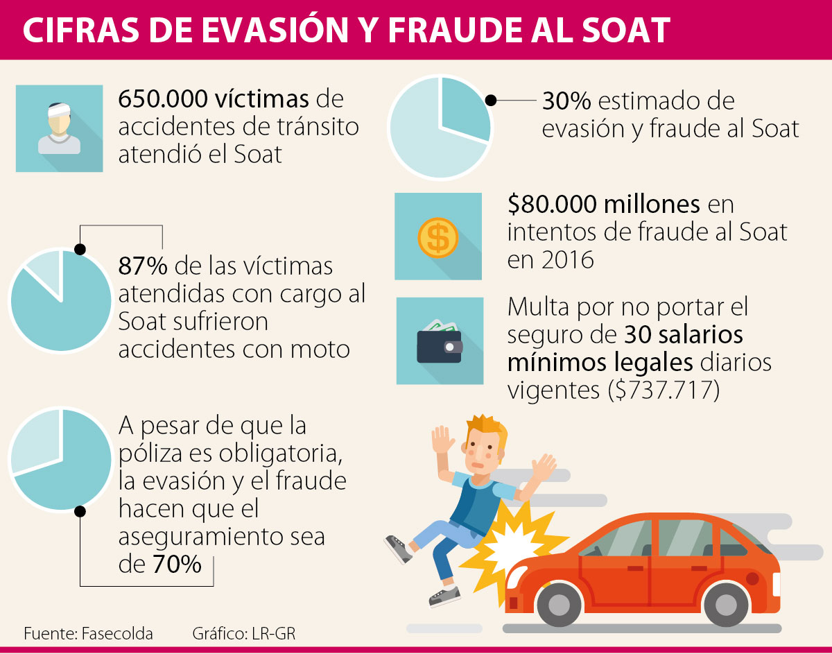 Algunos de los principales problemas respecto a la emisión del seguro de tránsito en Colombia corresponden a la evasión y el fraude, ya que a pesar de que la póliza es obligatoria en todo el territorio nacional, estos factores hacen que el aseguramiento sea cercano a 70%.