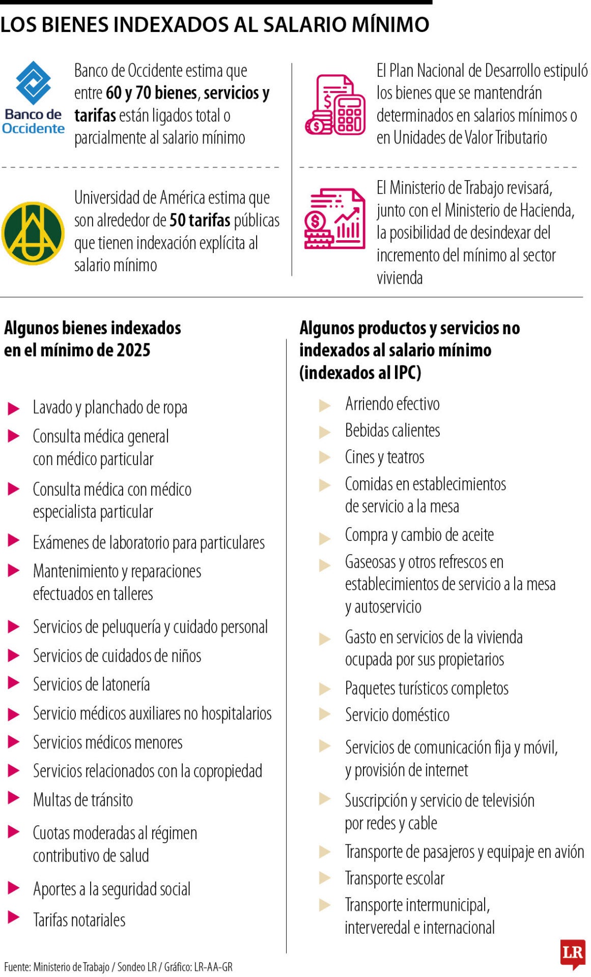 Henry Amorocho, profesor de hacienda y presupuesto de la Universidad del Rosario, detalló que los bienes y servicios indexados al salario mínimo no tienen determinación legal. Aseguró que estos son reglamentados bajo decretos presidenciales “que en reuniones como las que se hacen de concertación para la definición del sueldo deciden indexar cierto tipo de bienes y servicios tales como multas de tránsito, aportes a salud y pensión, matrículas de educación, medicina prepagada, Soat, pasajes intermunicipales, entre otros”, explicó Amorocho.