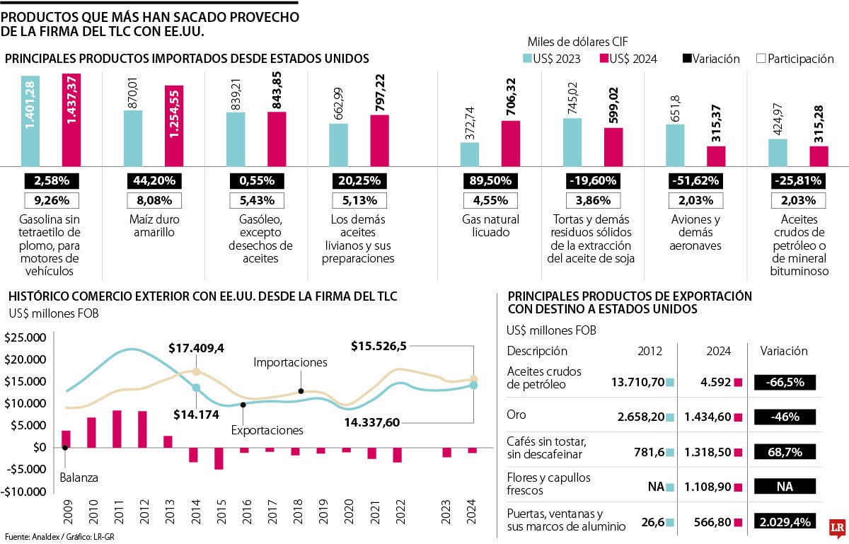 Los gasóleos, excepto los desechos de aceites y que contengan biodiésel, también han sacado provecho del acuerdo, ya que sus ventas al país norteamericano han crecido 38% desde 2012. Así como las rosas frescas, cortadas para ramos o adornos, que venden más de US$330 millones, un incremento de 29,9%.