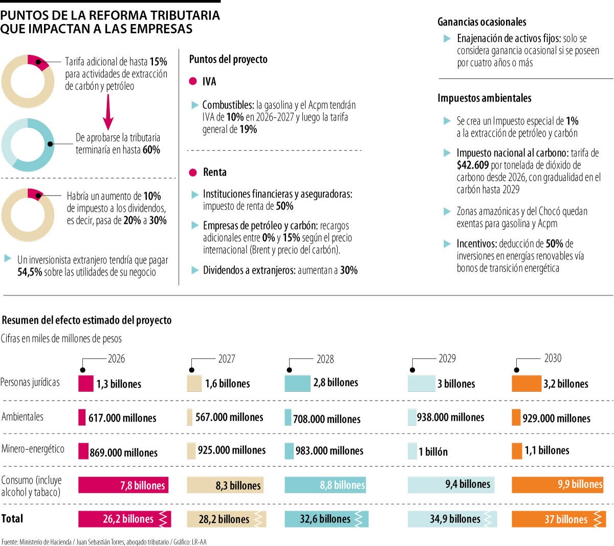 El resumen estimado de este proyecto en los rubros que impactan al sector empresarial es el siguiente: para personas jurídicas habría un efecto estimado de $1,3 billones en 2026; este aumentaría a $1,6 billones en 2027, a $2,8 billones en 2028, a $3 billones en 2029 y alcanzaría $3,2 billones en 2030.