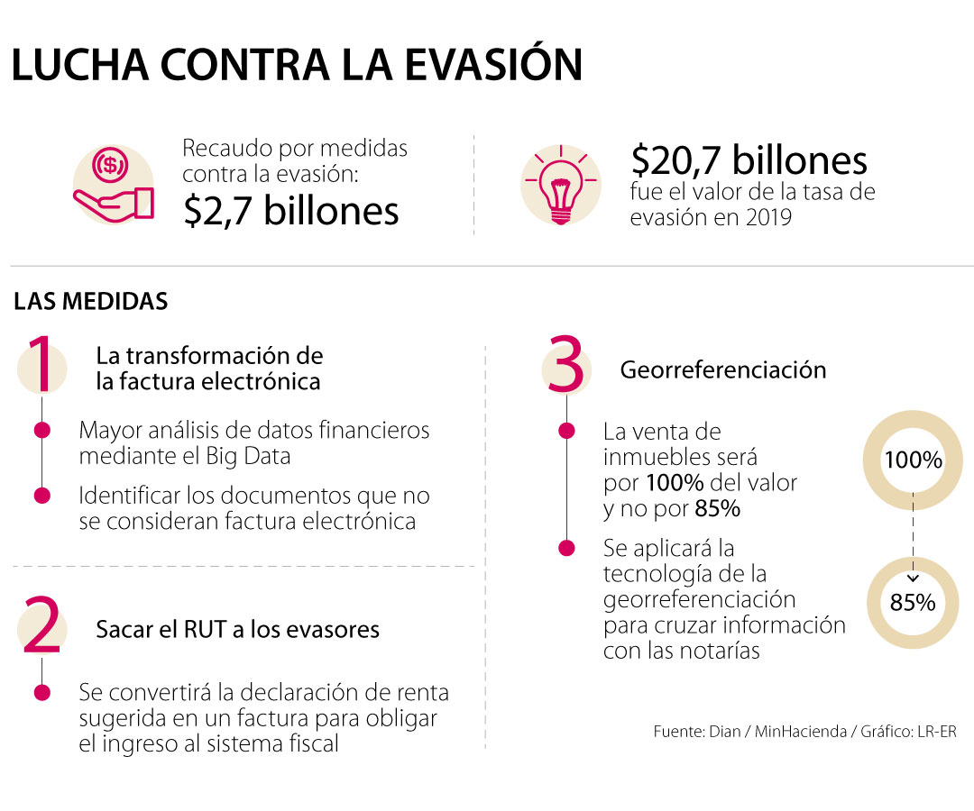 Las nuevas medidas que incorporaría la reforma contra la evasión de impuesto se harían a través de tres mecanismos puntuales. Estos son: la transformación de la facturación electrónica; el registro único tributario (RUT) a los evasores que no lo tienen; y la georreferenciación, que permitirá la compraventa de bienes inmuebles a su valor real.