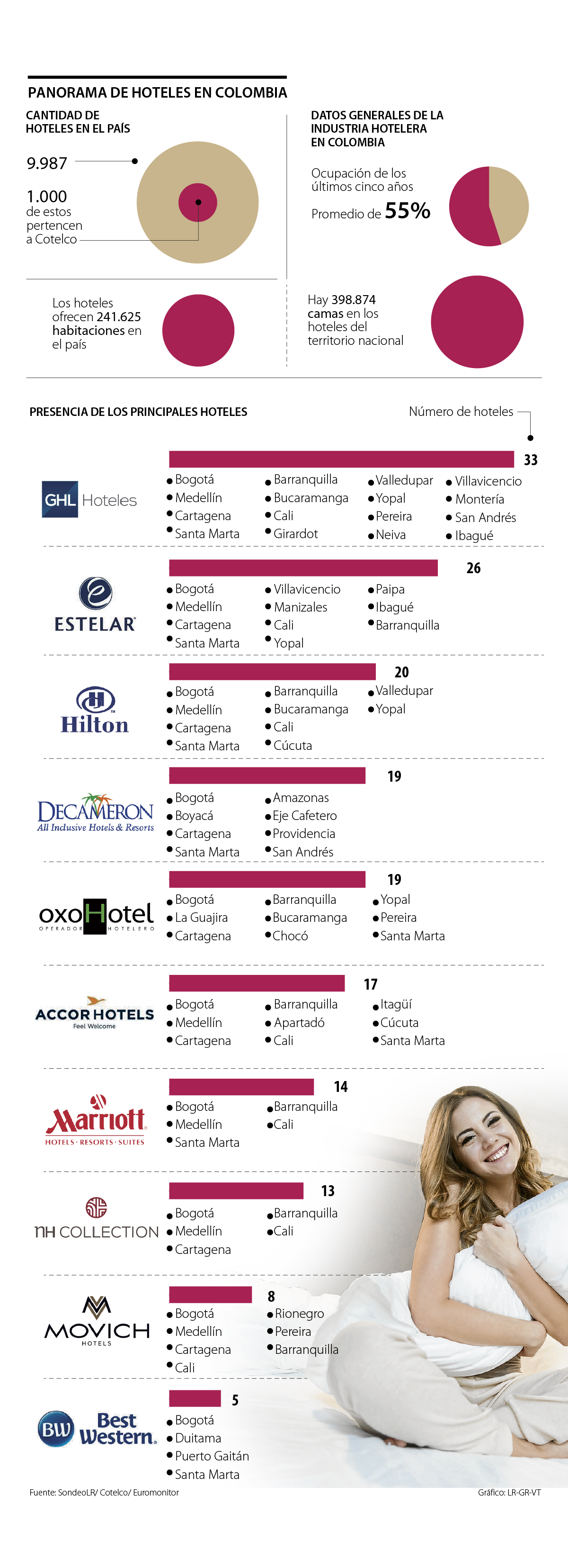 LR elaboró un listado para conocer cuáles son las cadenas hoteleras registradas en la Asociación Hotelera y Turística de Colombia (Cotelco) que más opciones de hospedaje tienen actualmente en Colombia y encontró que con 33 hoteles en más de 16 ciudades colombianas, GHL Hoteles lidera el mercado en territorio nacional.