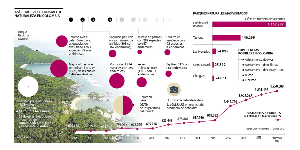 Los parques más visitados en su orden fueron: Corales del Rosario con 1,1 millones de visitantes, Tayrona con 446.299 visitantes, los Nevados con 54.095 visitantes, Sierra Nevada de Santa Marta con 25.312 visitantes y Chingaza con 24.831. Y la proyección de turistas para 2019 es de 1,9 millones aproximadamente.