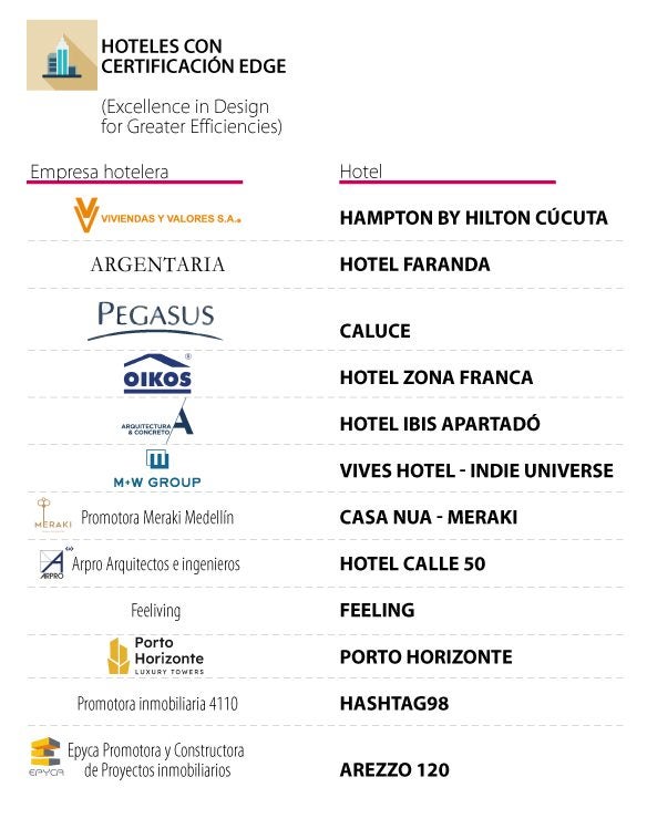 Es por ello que varios hoteles nacionales (ver gráfico) han recibido la certificación Edge (Excellence in Design for Greater Efficiencie), con la cual la Corporación Financiera Internacional (IFC) reconoce a los edificios que cumplen con un ahorro de mínimo 20% de energía, 20% en agua y 20% en energía incorporada en los materiales de la edificación.