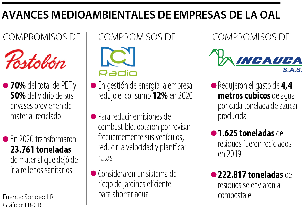 Son varias las empresas del conglomerado de la Organización Ardila Lülle (OAL) que han demostrado compromisos medioambientales, una de ellas es Postobón, que en 2020 reportó una reducción de 2,1 litros en el consumo de agua, por litro de bebida producida y reportó que 50% del material que introdujeron al mercado fue reciclado, además, 70% del material PET y 50% de vidrio de sus envases provinieron del reciclaje.