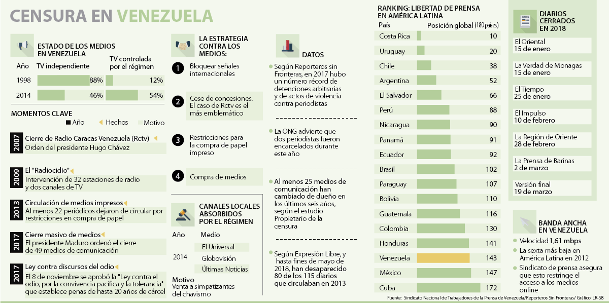 La voz del periodismo en Venezuela se ha ido apagando durante los últimos 20 años, pues los golpes que el chavismo le ha asestado a los medios de comunicación, desde 1998, han impedido la labor periodística. El Sindicato Nacional de Trabajadores de la Prensa en Venezuela (Sntp) registra que, desde el inicio de la era que lideró la figura de Hugo Chávez, han cerrado 60 medios, aunque Expresión Libre asegura que, entre 2013 y mayo de 2018, han desaparecido 80 de los 155 periódicos que circulaban hace cinco años.