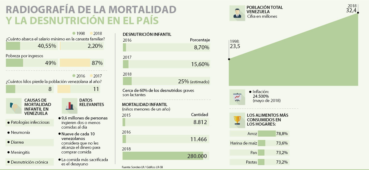 Es innegable que la crisis económica en Venezuela ha golpeado por igual a toda su población, pero la falta de acceso a bienes básicos para subsistir, como los alimentos, ha provocado que los niños sean los más abatidos por la desgracia que vive el vecino país en la actualidad, pues los índices de desnutrición para 2018 pronostican que aproximadamente 280.000 niños morirían por causas ligadas a problemas derivados de una mala alimentación y condiciones precarias.
