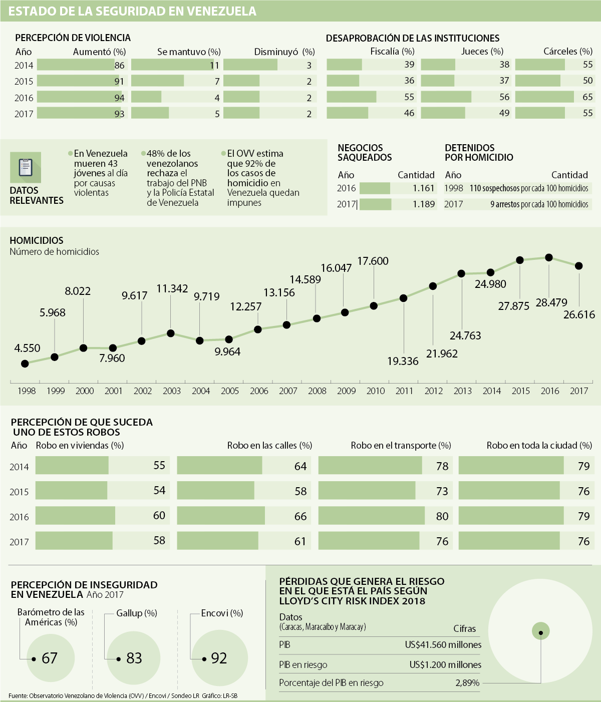 La institución también destacó que 92% de los casos de homicidio que se registran anualmente en Venezuela quedan impunes. Este dato adquiere proporción cuando se analiza la cantidad de detenciones por este delito que se hacen efectivas cada año. Mientras que en 1998 fueron arrestados 110 sospechosos por cada 100 muertes, para 2017 solo se capturaron nueve sospechosos por cada 100 casos.