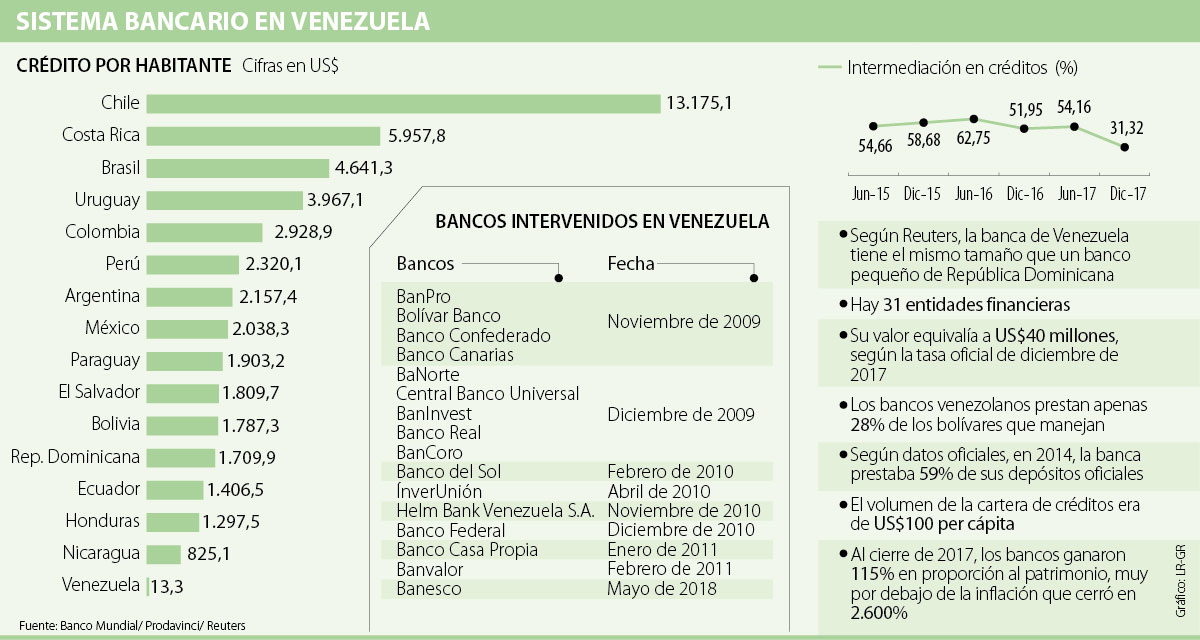 Otra de las consecuencias de la inoperancia del sistema financiero en Venezuela es que, según estimaciones de Reuters, los bancos apenas pueden prestar 28% de los bolívares que manejan internamente. Hace tres años, la banca prestaba 59% de sus depósitos oficiales y el volumen de la cartera de créditos era de US$100 por cada venezolano.