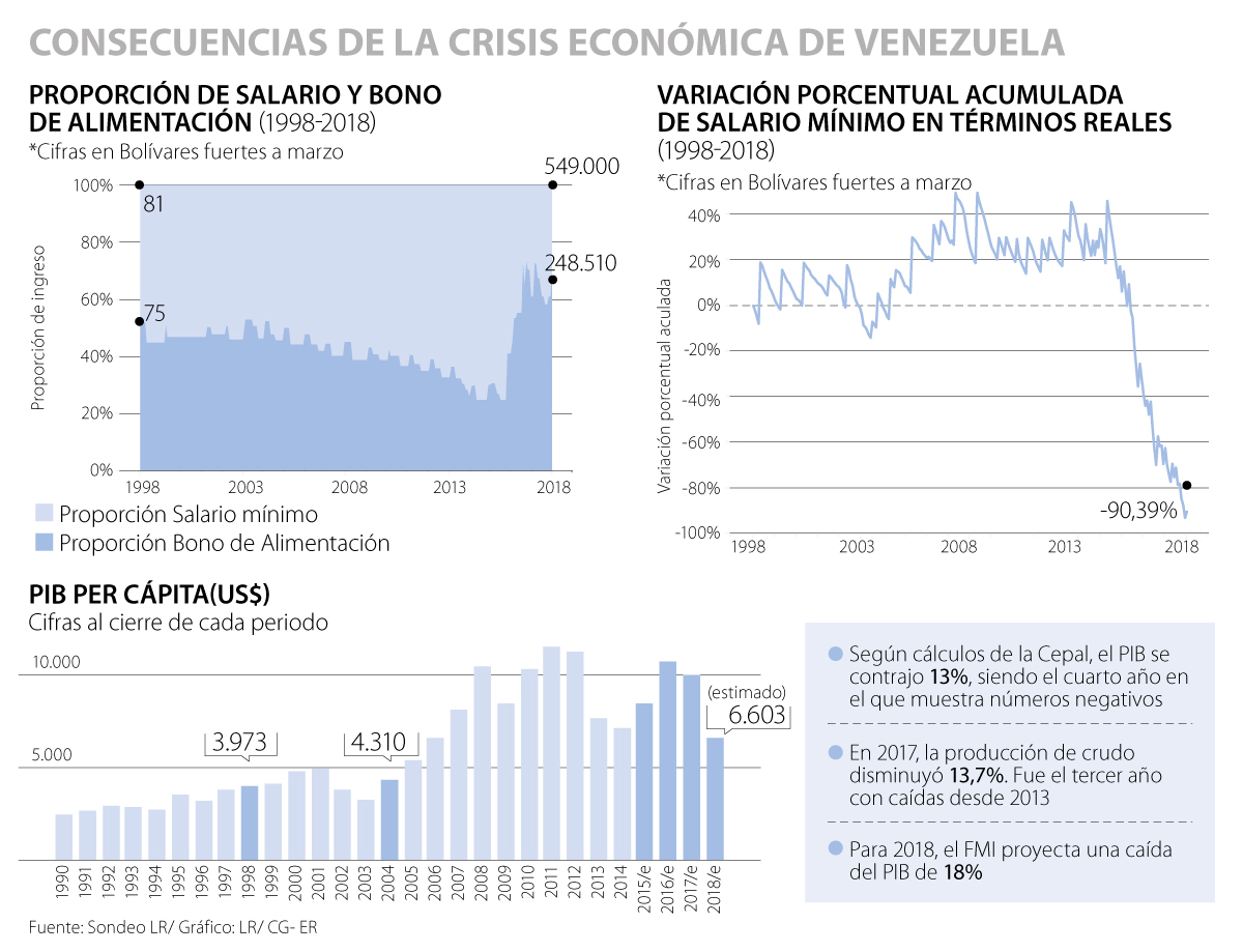 De ingresos mínimos mensuales de 156 bolívares fuertes en enero de 1998 (contando 85 del ticket de alimentación), la población pasó a tener 4.500 bolívares soberanos mensuales este año, según el último incremento que anunció el presidente Nicolás Maduro el pasado 30 de noviembre. Dichas ganancias se dividieron en 450 bolívares soberanos de un bono de alimentación, que es exclusivo para comprar comida, y el dinero restante que representa el salario mínimo mensual vigente en el país.