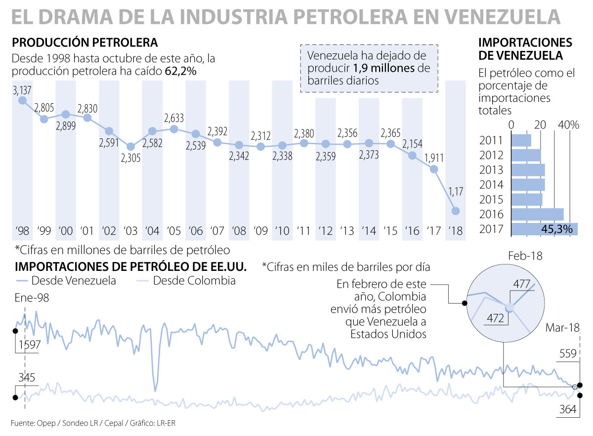 La crisis petrolera en Venezuela también se refleja con los envíos hacia Estados Unidos. Por ejemplo, en febrero de este año, las ventas de crudo a EE.UU. desde el país cayeron tanto (472.000 barriles) que Colombia logró mayores exportaciones (477.000 barriles diarios), cuando hace 20 años, lograba poner cerca de 1,5 millones de barriles de crudo al día.