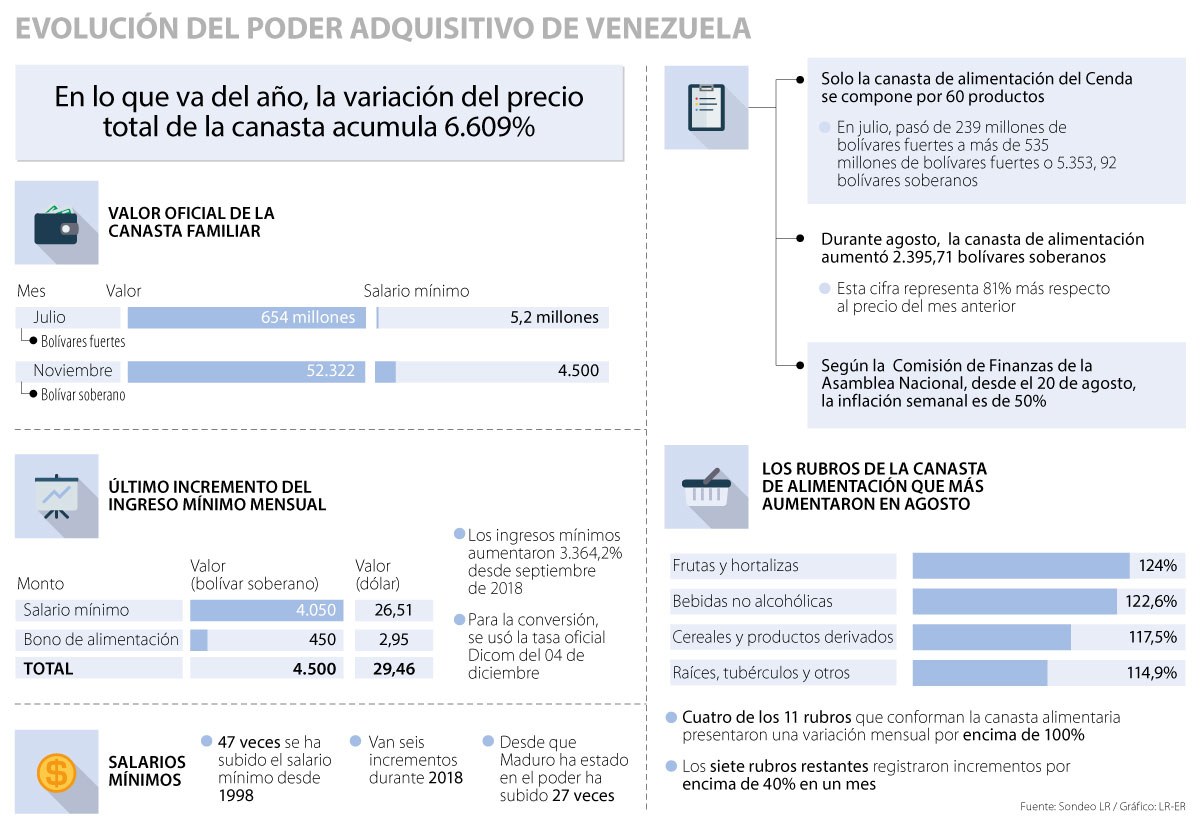 Desde diciembre de 2012, el poder adquisitivo comparado con la canasta familiar ha ido en picada. En los últimos tres años paso de ser de dos dígitos a uno. Por ejemplo, en diciembre de 2015 con el salario base se podía acceder a 16,4% de la canasta. Luego, en 2016, bajó a 6,1%. A finales de 2017, llegó a 2,2% y en abril de este año a 1%.