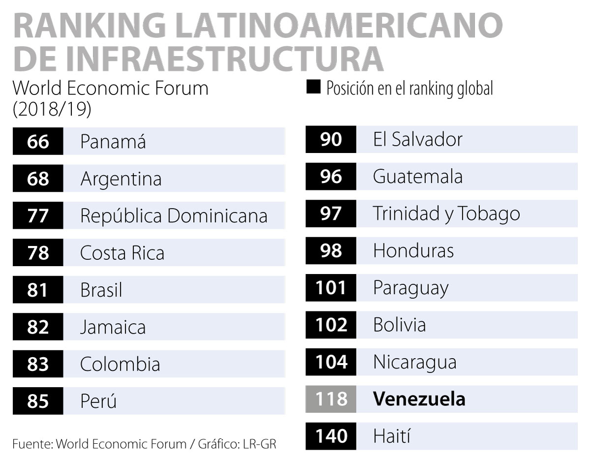 Según el último ranking de infraestructura del World Economic Forum, Venezuela es el penúltimo país de América Latina en materia de competitividad dentro de este sector, ubicándose en el puesto 117 del escalafón global, superando únicamente a Haití.