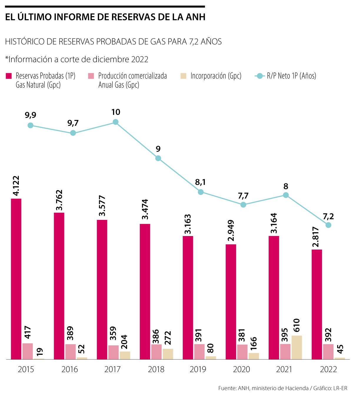 La disminución se evidenció en el volumen de gas, de acuerdo con el informe de la Agencia Nacional de Hidrocarburos (ANH), pues se pasó de 3.164 giga pies cúbicos (Gpc) en 2021 a 2.817 en 2022. Mientras que las reservas probadas de gas se situaron en 2.82 terapies cúbicos (Tpc), con una diferencia de -0,35 con respecto a 2021, la producción de gas comercializado fue de 0,39 terapies cúbicos. Para 2021, el reporte indicó que las reservas eran de ocho años, es decir que en este insumo también bajó si se mide en tiempo.
