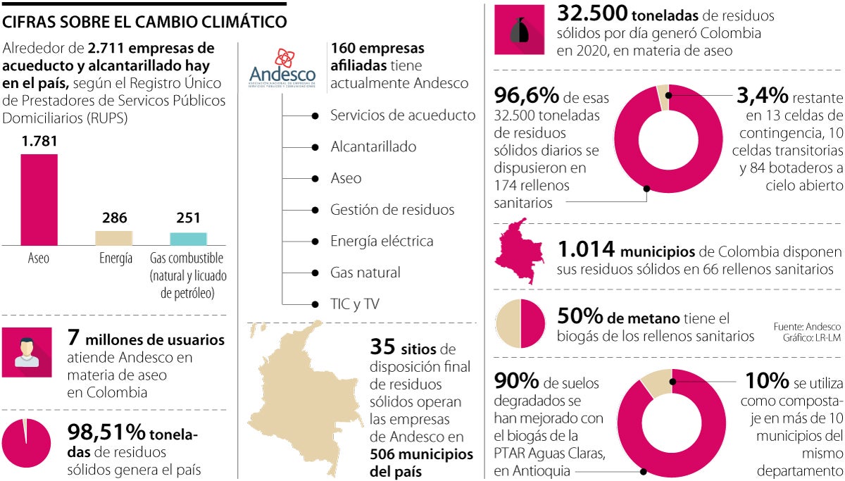 Las compañías de acueducto, alcantarillado y aseo, que atienden el servicio de aseo a más de 28 millones de habitantes del país, operan 35 sitios de disposición final de residuos sólidos de 506 municipios, que se distribuyen entre rellenos sanitarios, celdas de contingencia y parques tecnológicos ambientales, en donde gestionan 8,77 millones de toneladas al año.