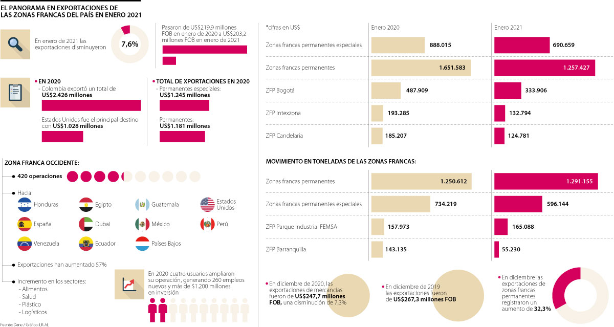Como actores importantes para la exportación de productos desde el país, las zonas francas han tenido que resistir la embestida económica de la pandemia del covid-19. Según cifras del Dane, en enero de 2021 las zonas francas permanentes del país movieron 734.219 toneladas, mientras que las zonas francas permanentes especiales, 1.250.612.