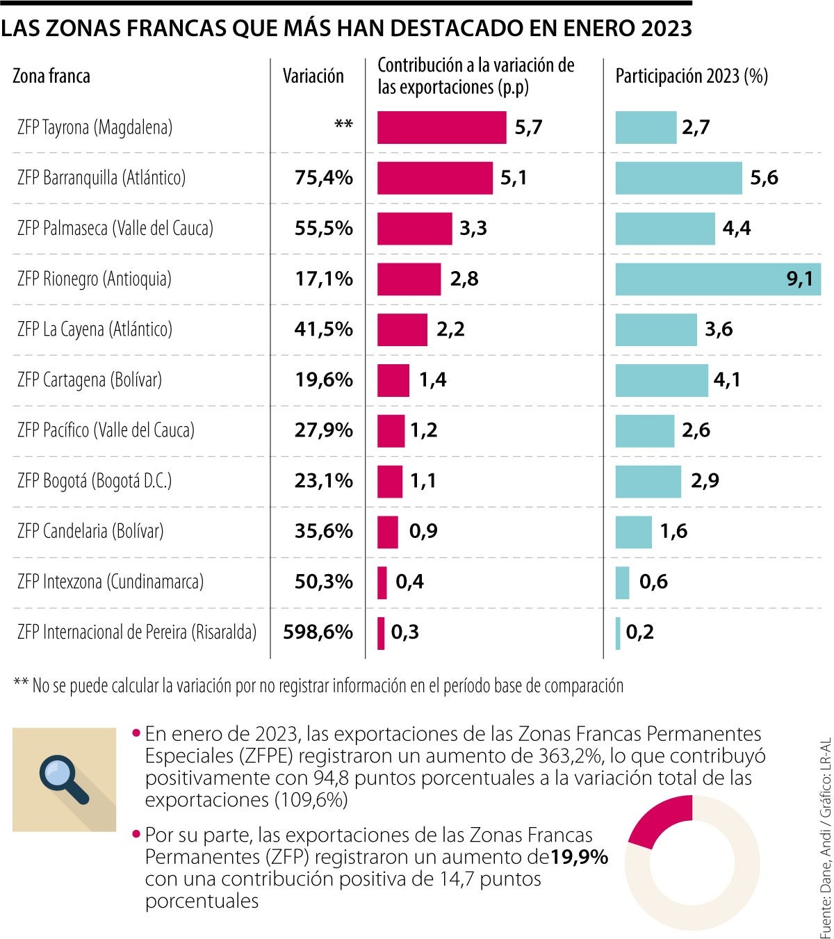 En conjunto, las ZFP Tayrona, que no registró información en el periodo, y ZFP Barranquilla contribuyeron positivamente con 10,8 puntos porcentuales.