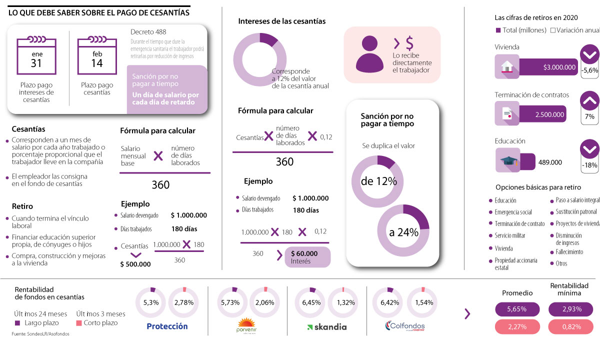 Lo anterior es válido si la persona tiene un salario fijo. En cambio, explicó Iván Jaramillo, director del Observatorio Laboral de la Universidad del Rosario, “si el salario del trabajador es variable, el salario base para calcular es el promedio de los 12 meses anteriores a la liquidación de la prestación”. El experto, además, recordó que la sanción por no consignar esta prestación a tiempo es de un día de salario por cada día de retraso en el pago.