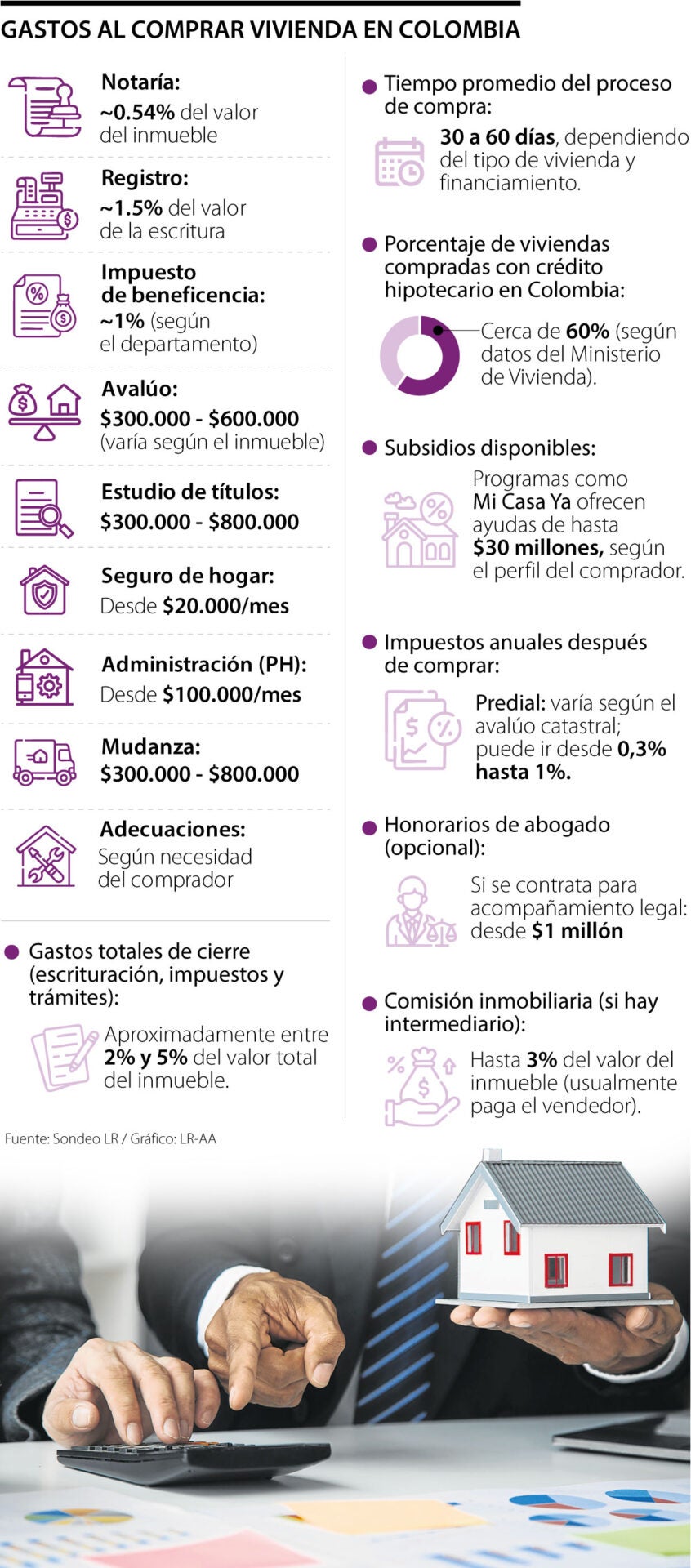 Henry Amorocho, profesor de Hacienda Pública y Presupuesto de la Universidad del Rosario, mencionó que “los gastos que se deben tener en cuenta al momento de adquirir vivienda van más allá del financiamiento. Incluyen notaría, registro, impuestos como beneficencia y retención en la fuente, avalúo, estudios de títulos, certificado de tradición y libertad. También hay que prever gastos para adecuaciones, especialmente si el inmueble viene en obra gris o no es del gusto del comprador”.