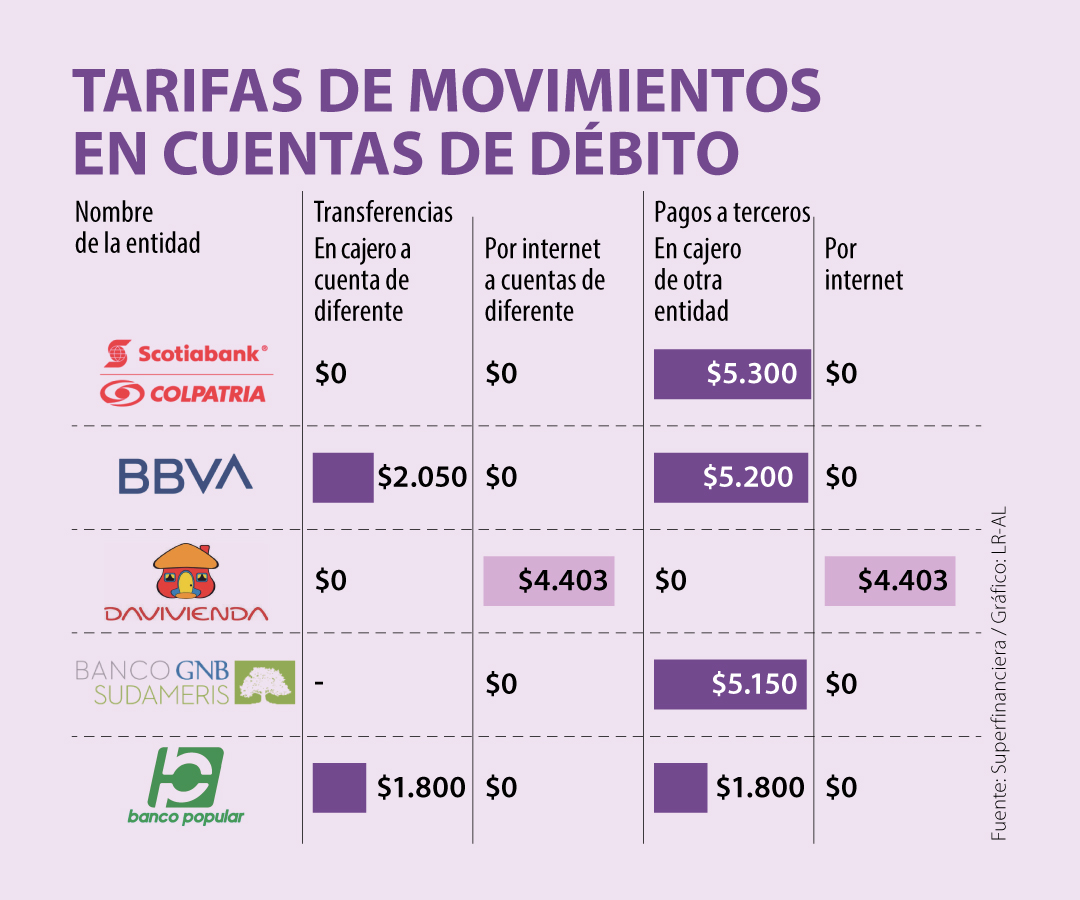 De las 10 principales entidades bancarias del país, es en Davivienda, donde menos varían tarifas pues tienen cobros de hasta $4.403