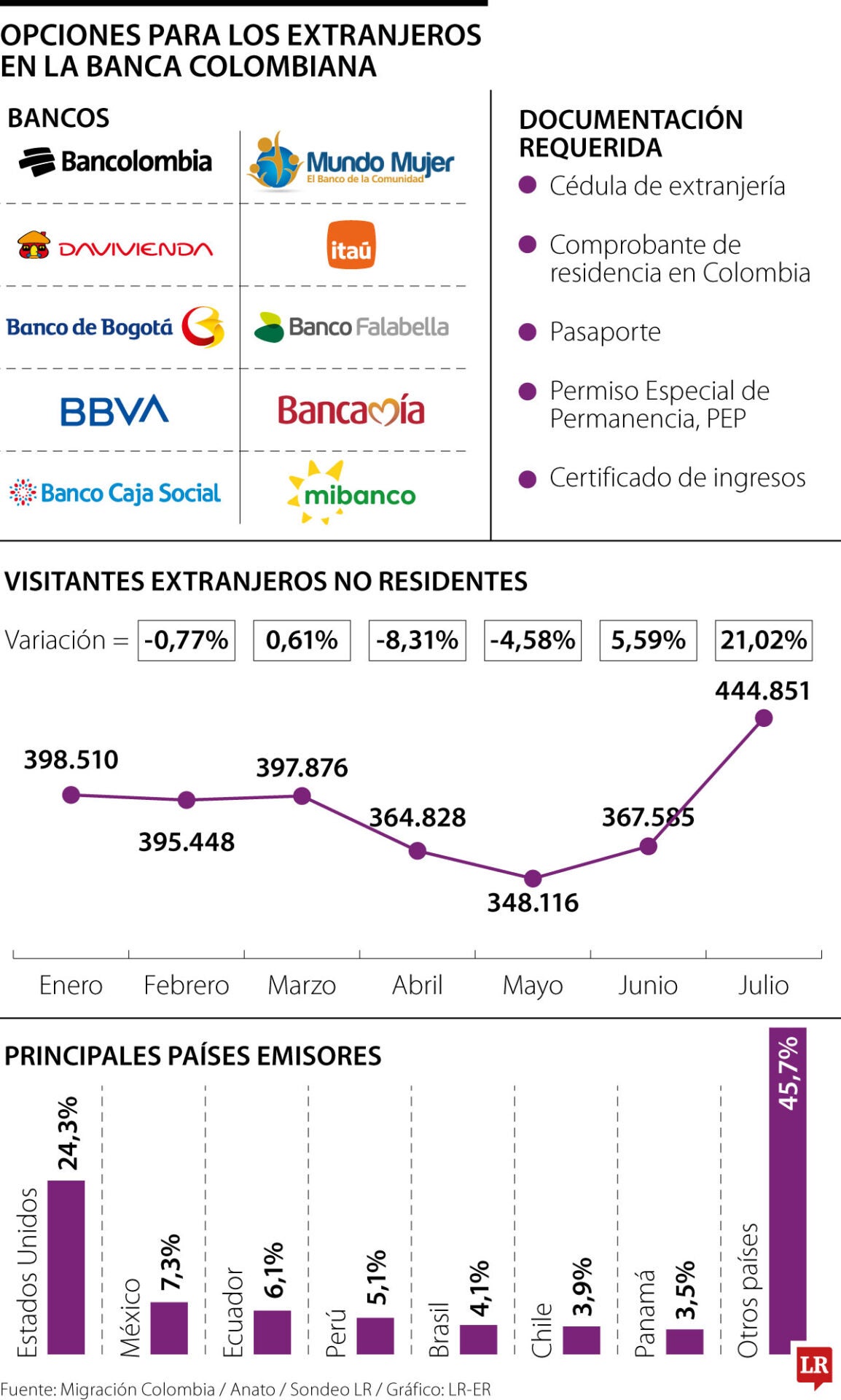 A estos tres se suman Bbva, Banco Caja Social, Banco Mundo Mujer, Itaú, Banco Falabella, Mi Banco, entre otras, como entidades que ofrecen a los extranjeros la posibilidad de abrir sus productos bancarios.