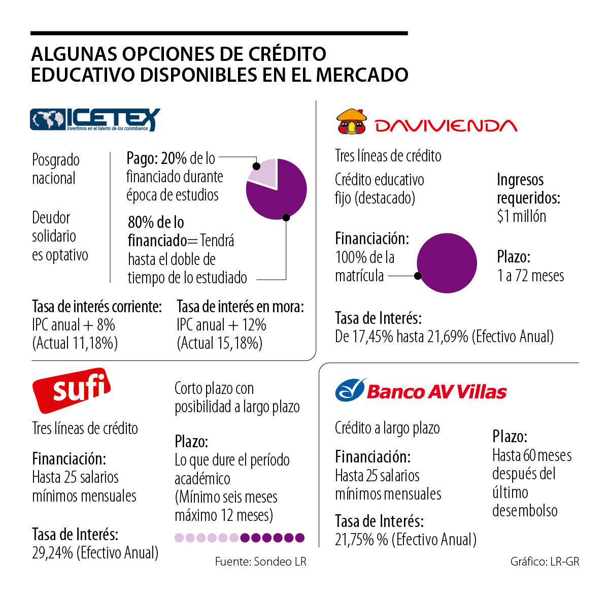 Uno de los créditos con menor tasa de interés es el del Banco Davivienda. Esta entidad ofrece cuatro líneas de crédito educativo que pueden ser destinadas a estudios de posgrado. El crédito puede financiar hasta 100% de la matrícula. El estudiante, dependiendo de la modalidad que escoja, tendrá hasta 72 meses para pagar. La tasa de interés varía desde 17,45% hasta 21,69%. En caso de que el deudor entre en mora, pagará intereses tasados a 28,93%
