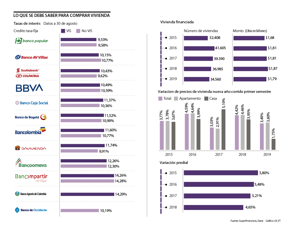 Según datos de la Superintendencia Financiera, la tasa de interés fija en pesos más baja del mercado para compra de Viviendas de Interés Social (VIS) la tiene el Banco Popular, con 9,53%, mientras que la más alta es de 14,29%, del Banco Agrario. Para vivienda no VIS, Popular ofrece préstamos a 9,58% y Bancompartir a 14,28%, siendo estas la más baja y la más alta del mercado para inmuebles de costos superiores a $112 millones.