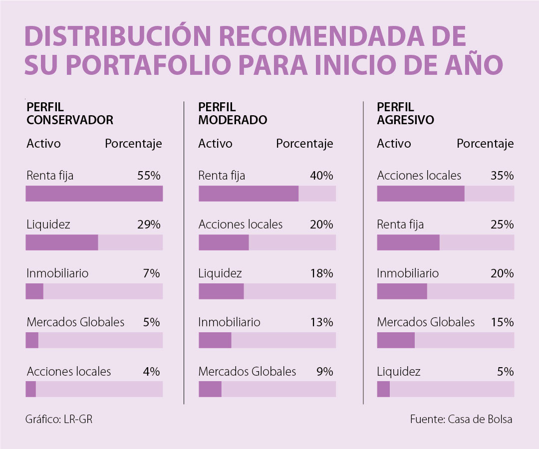 Allí las acciones locales tienen mayor preponderancia que en el conservador y significan 20% del portafolio, mientras las internacionales pueden ser 9%, así se configura casi una tercera parte del portafolio en activos de renta variable; lo que implica un riesgo más alto, pero a su vez mayores retornos. Hay que recordar que según los expertos la posición en deuda soberana y corporativa debe ser en activos de media duración para este periodo.