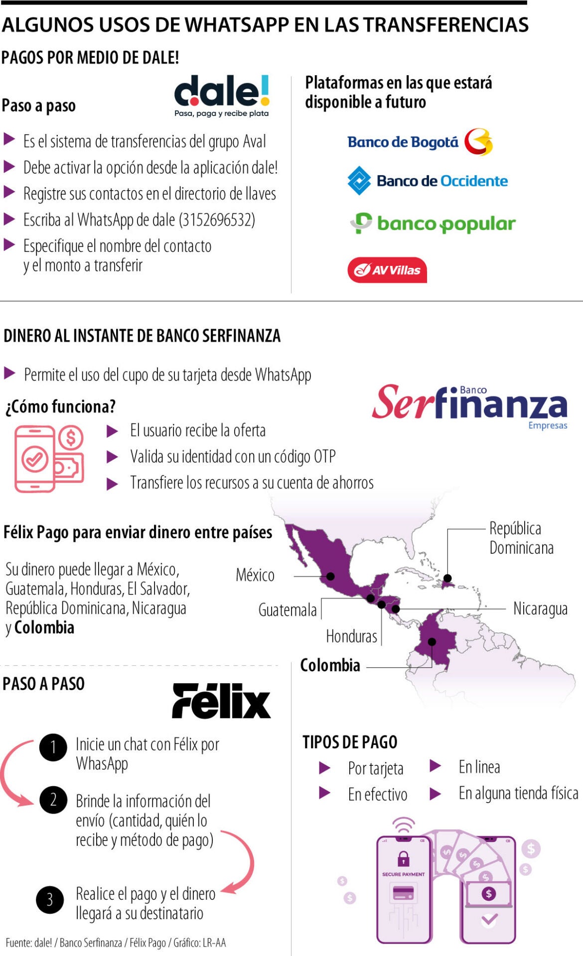 Estas no son las únicas alternativas presentes en el mercado colombiano, pues entre todo aparece Félix Pago, una plataforma que permite el envío de dinero desde WhatsApp a México, Guatemala, Honduras, El Salvador, República Dominicana y Colombia. Su servicio está disponible a cualquier hora del día y cualquier día de la semana, abriendo la posibilidad de realizar pagos por medio de tarjeta, efectivo, en línea o en tiendas físicas.