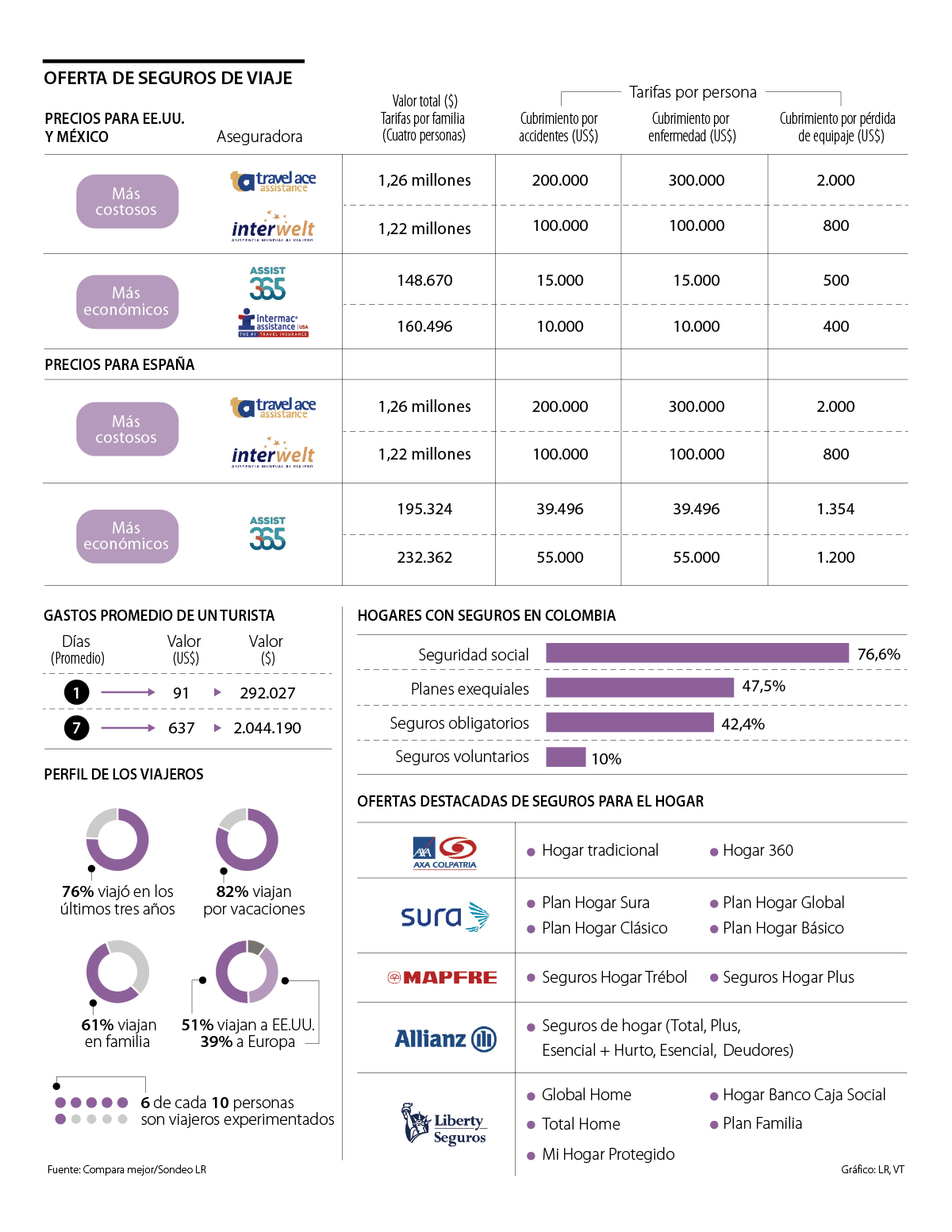 LR hizo el cálculo del costo para asegurar a una familia de al menos cuatro personas en un viaje de siete días a destinos como Estados Unidos, México o España, que suelen ser los más visitados por los colombianos según datos del Ministerio de Comercio, Industria y Turismo.