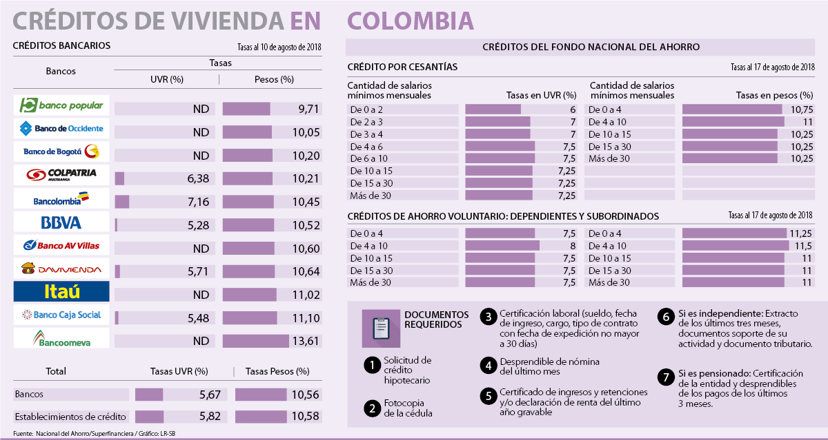 En cuanto al total de las instituciones bancarias y los establecimientos de crédito, la Superfinanciera muestra que los bancos tienen 5,67% en tasas UVR y 10,56% de tasas en pesos, mientras que los establecimientos de crédito manejan 5,82% en UVR y 10,58% en pesos.