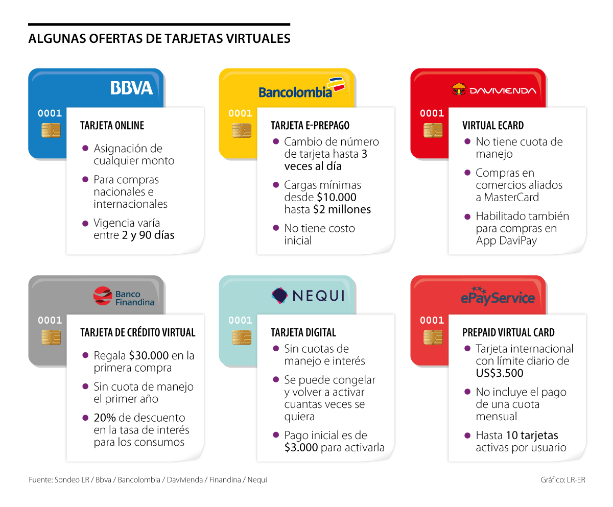 Lo primero que debe tener en cuenta al acceder a esta herramienta financiera es que hay dos tipos de tarjetas virtuales: las de crédito y las que son recargables con un monto específico que es seleccionado de la cuenta de ahorros. Si su opción es la última, Bbva ofrece la tarjeta online que se activa por medio de la app Bbva Wallet, y que también permite obtener recursos de la tarjeta de crédito que ya tenga el cliente. Vanesa Sánchez, product manager de tarjetas de crédito de Bbva Colombia, explicó que “algunos de los beneficios de obtener esta tarjeta son: creación y habilitación de forma inmediata y escoger el tiempo en el que estará habilitada la tarjeta”.