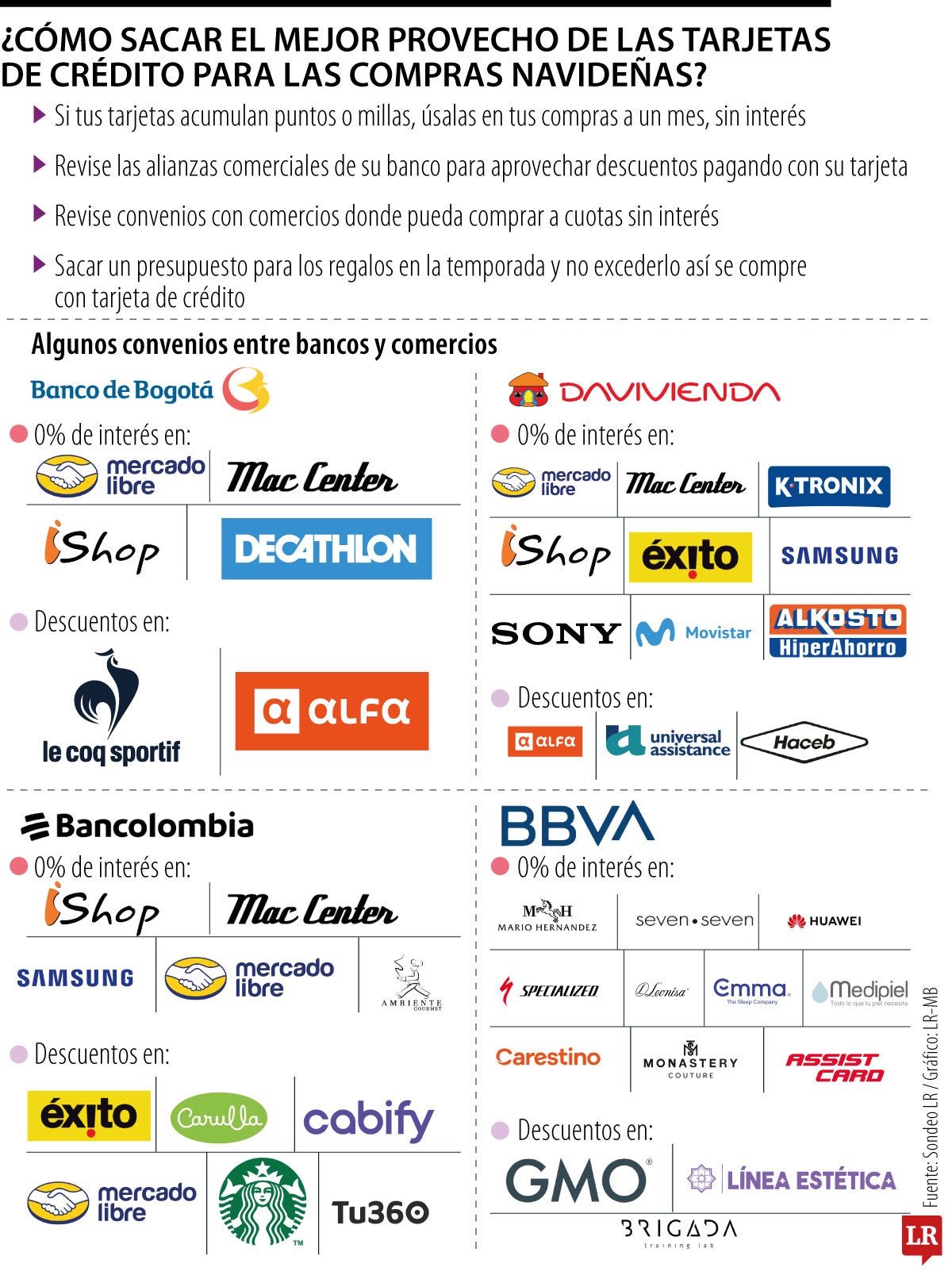 Según un sondeo, entidades como el Banco de Bogotá, Bancolombia y Davivienda, tienen compras a 0% de interés en comercios como Mac Center, iShop, Mercado Libre y entre otros. Y en Bbva, los usuarios pueden acceder a compras con 0% en Mario Hernández, Seven Seven, Assist Card, Monastery Couture, Medipiel, Carestino y otros.