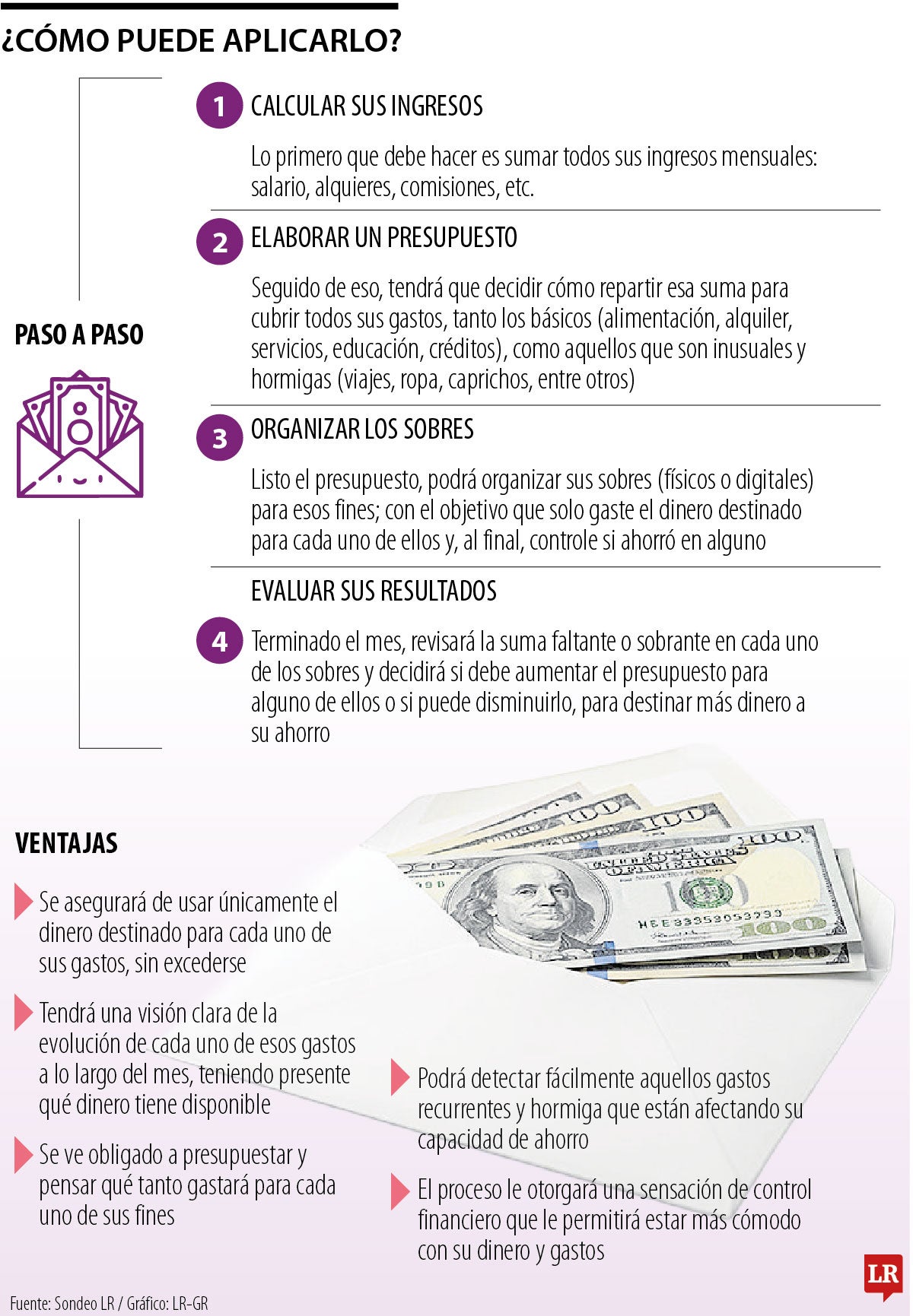 En sí, el proceso consiste en controlar el gasto del dinero por medio de sobres nombrados y destinados a objetivos específicos. En cada uno de ellos, se guardará un monto suficiente para cubrir lo presupuestado en cada categoría y, a lo largo del mes, se utilizará únicamente esa suma o, de ser posible, una menor para ahorrar el sobrante. El fin último es, a parte de tener consciencia total sobre lo que se gasta en cada área de vida, identificar los puntos claves en los que se puede mejorar.