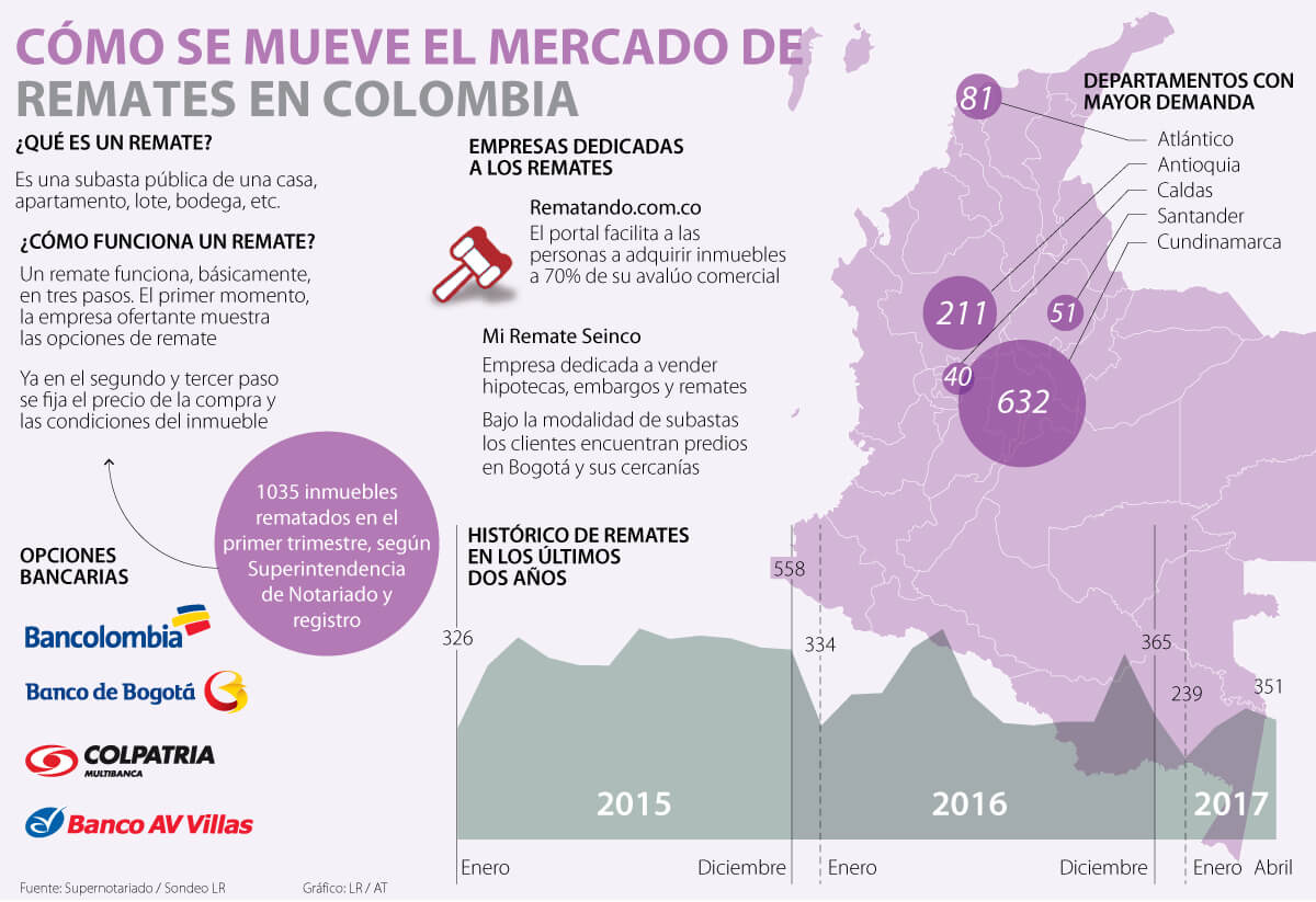 Cifras de la Superintendencia de Notariado y Registro arrojaron que, en el primer trimestre del año, se remataron cerca de 1.035 inmuebles, de los cuales, se destacaron cinco departamentos: Cundinamarca con 632, Antioquia con 211, Atlántico con 81, Santander con 51 y Caldas con 40.