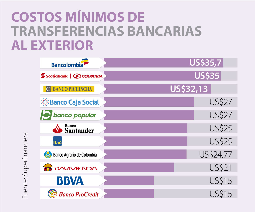 De acuerdo con datos a octubre de este año de la Superfinanciera, Banco Procredit y Bbva Colombia, son las dos entidades que tienen la comisión mínima por giros al exterior más baja, al ubicarse en US$15. Seguida de Banco Davivienda con US$21; Banco Agrario con una tarifa de US$24,77; Itaú y Banco Santander ofrecen este servicio a un precio mínimo de US$25; y Banco Caja Social y Banco Popular US$27 dólares (ver gráfico).
