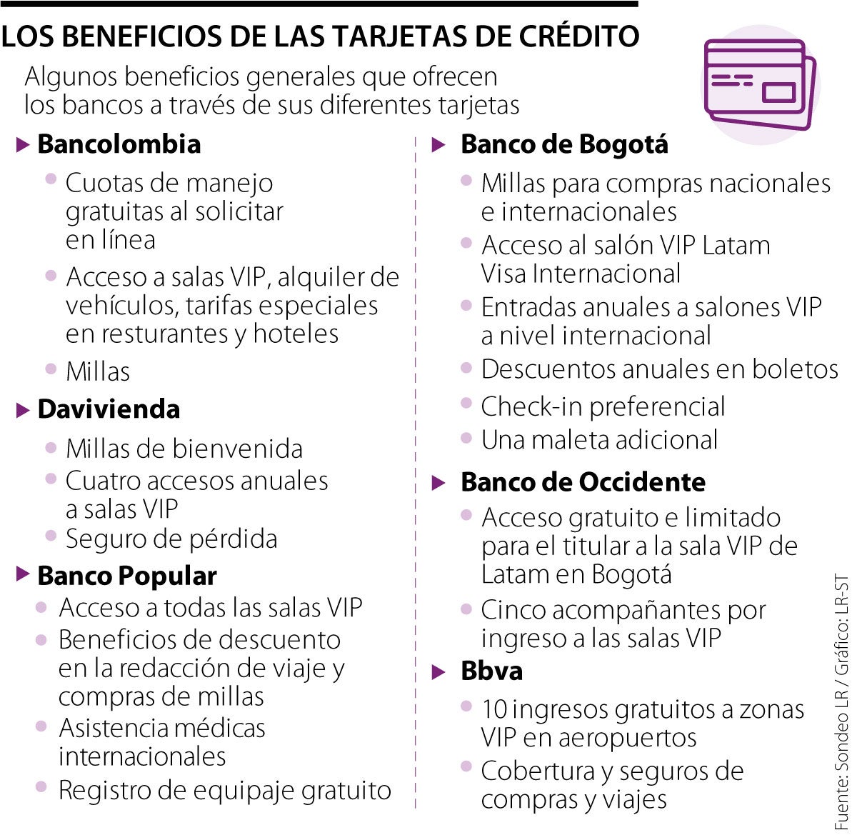 En otra opción, Banco de Bogotá ofrece entradas anuales a salones VIP a nivel internacional, check-in preferencial, millas para compras nacionales e internacionales, entre otros.