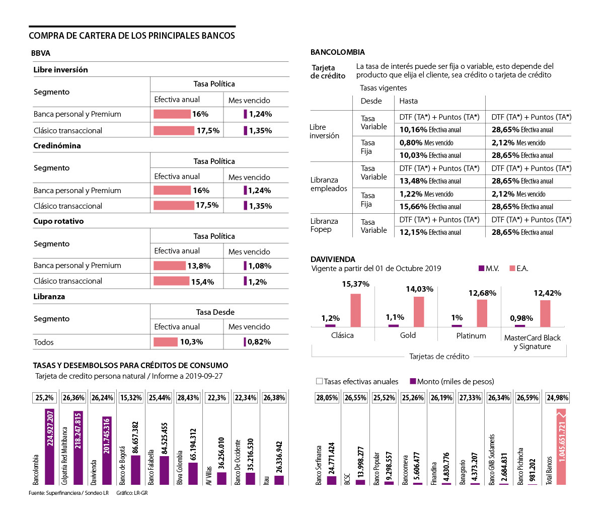 En el Banco de Bogotá, las tarifas vigentes a agosto que se manejan para una tarjeta clásica son de 1,3% M.V. y 15,6% E.A.; en el caso de las libranzas, la compra de cartera de consumo para personas está en 1,58% M.V. y 20,79% E.A. Entre las condiciones que tiene la compra de cartera de este banco está un monto mínimo desde $1 millón, y un plazo desde 24 a 72 meses.