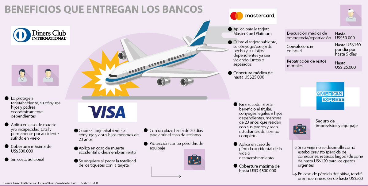 Las cuatro grandes franquicias, Visa, Mastercard, Diners y American Express, ofrecen beneficios de cobertura de transporte y accidentes a sus tarjetahabientes que en la mayoría de los casos no solo los cobijan a ellos sino también a su familia, siempre que los tiquetes hayan sido adquiridos por medio de sus tarjetas de crédito.