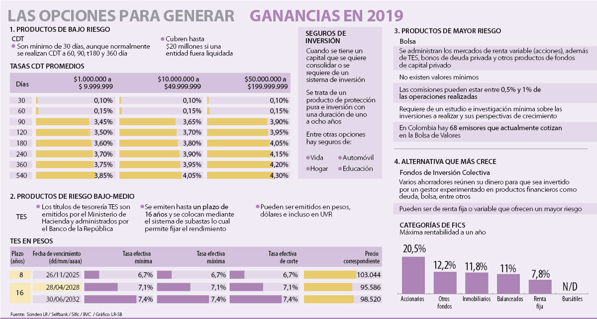 En ese abanico se encuentran los tradicionales Certificados de Depósito a Término (CDT); los seguros de inversión, las acciones en el mercado de valores y los fondos de inversión colectiva (Fic), que se han posicionado como una de las opciones que más crece y ofrece alternativas desde $50.000 mensuales.