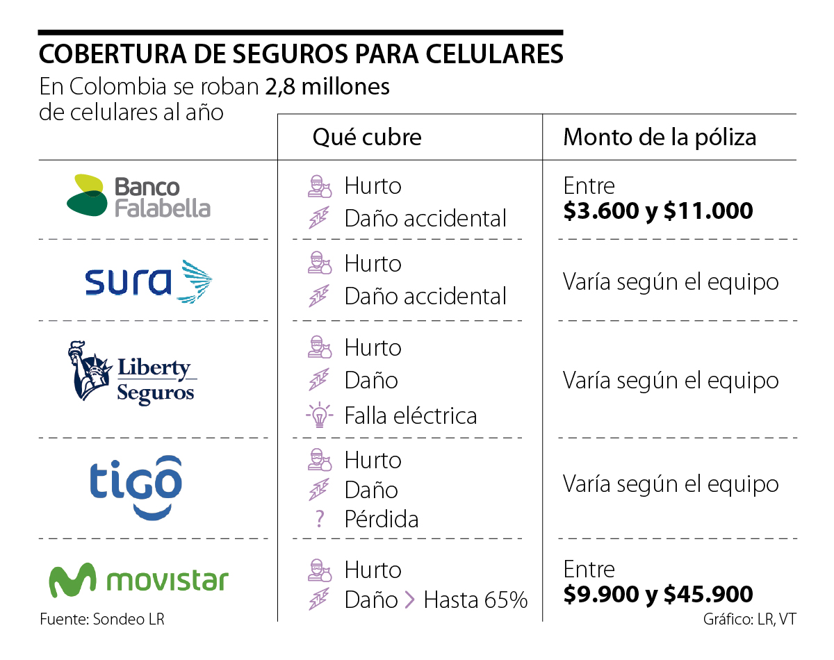 Es el caso de TigoUne, que ofrece la posibilidad de escoger. "Nuestros usuarios en plan pospago de $100.000 tienen, sin costo adicional, seguro completo que cubre: hurto calificado y simple, daño total y daño a la pantalla. En plan pospago de $75.000 tienen, sin costo adicional, seguro que cubre rotura de pantalla por accidente", explicó la empresa. El seguro de equipos solo aplica para los nuevos planes Tigo 75.000 y 100.000.