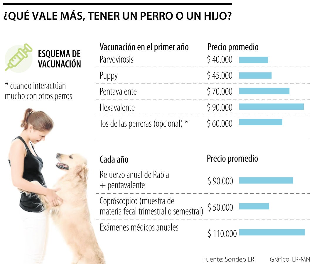 Si se incluye el esquema de vacunación del primer año, el refuerzo anual, coproscópico, muestra de materia fecal semestral, exámenes médicos y chequeo anual, alimentación, guardería cinco días con transporte, accesorios y seguros de vida, el total supera los $11 millones.